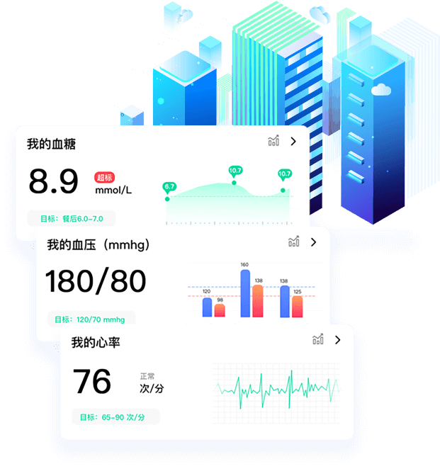 健康模塊,飽含血糖、血壓、尿酸、心率以及運動健康指數(shù),為用戶提供數(shù)據(jù)云儲存、健康預警。系統(tǒng)還可根據(jù)用戶平時的檢測指數(shù),運算出健康目標值